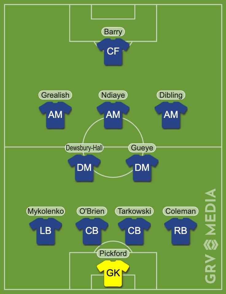 Jordan Pickford lines up in goal for Everton with a changed back four ahead of him. Seamus Coleman comes in after his heroics for Ireland, and so too does Jake O’Brien.